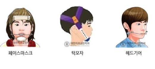 - 주로 사춘기이전의 어린이, 청소년에서 무턱이나 주거턱등의 골격적인 부조화가 예상될 때 사용하는 헤드기어, 친컵등의 장치를 말합니다
