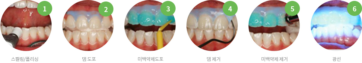 치과에서 고농도의 과산화수소를 사용하여 시행하며 작용을 촉진시키기 위해 광원을 조사하여